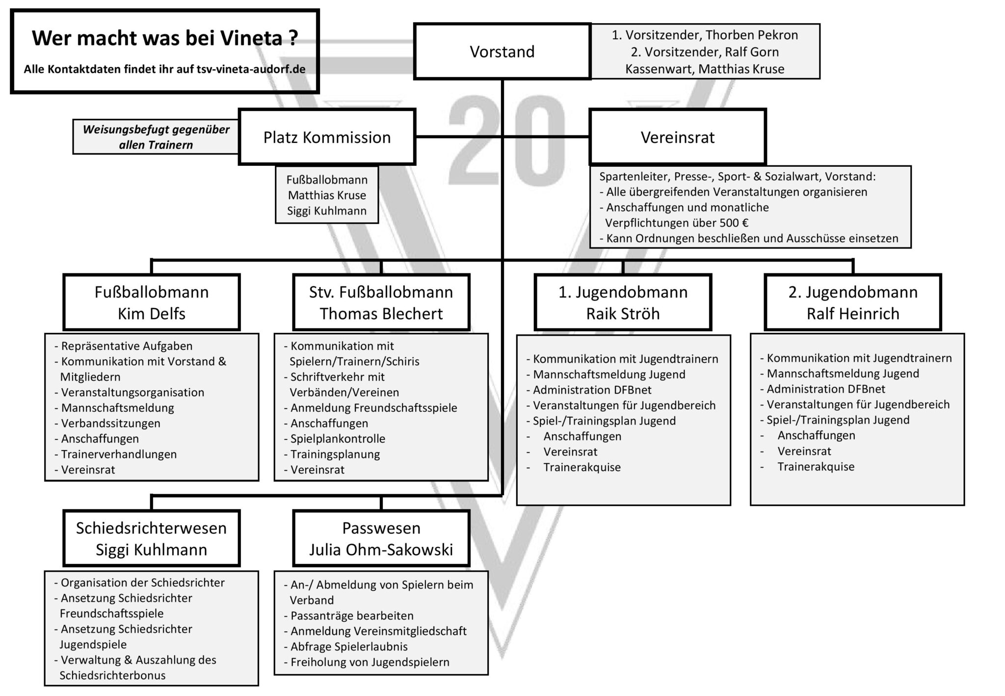 Fußball > Verantwortliche Verantwortliche Obmann Kim Michael Delfs E-Mail:kim.delfs@tsv-vineta-audorf.de Telefon:01512 8358 010 stv. Obmann Thomas Blechert E-Mail:thomas.blechert@tsv-vineta-audorf.de Telefon:0162 7938 784 1. Jugend-Obmann Raik Ole Ströh E-Mail:raik.ole.stroeh@tsv-vineta-audorf.de Telefon:01516 7843 157 2. Jugend-Obmann Ralf Heinrich E-Mail:ralf.heinrich@tsv-vineta-audorf.de Telefon:0173 9130 501 Schiedsrichter-Obmann Siggi Kuhlmann Telefon:0173 3822 914 Passwesen Julia Ohm-Sakowski E-Mail:passwart-fussball@tsv-vineta-audorf.de Telefon: