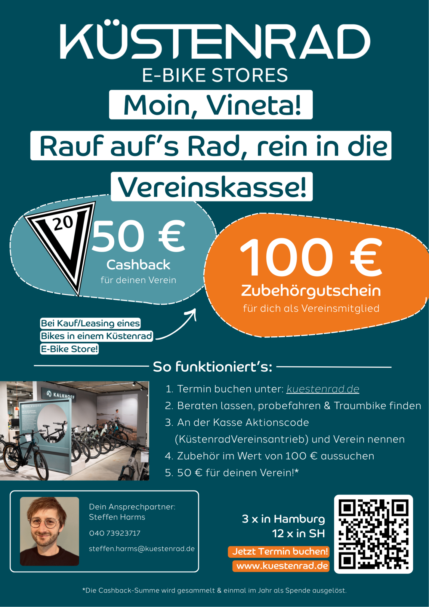Mit dem Kauf eures Traumbikes bei Küstenrad in Rendsburg (Friedrichstädter Straße 79) erhaltet ihr einen 100 Euro-Zubehörgutschein und unterstützt uns zusätzlich – alle weiteren Infos findet ihr auf dem Infoflyer.
